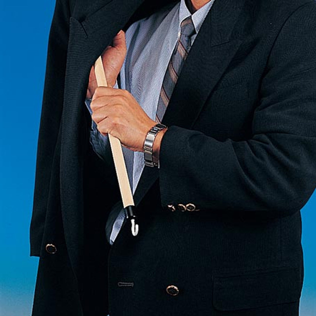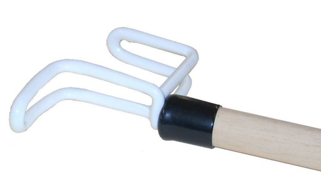 Has a smooth wooden shaft with a large plastic-coated hook at one end and a smaller ‘C” hook at the other.