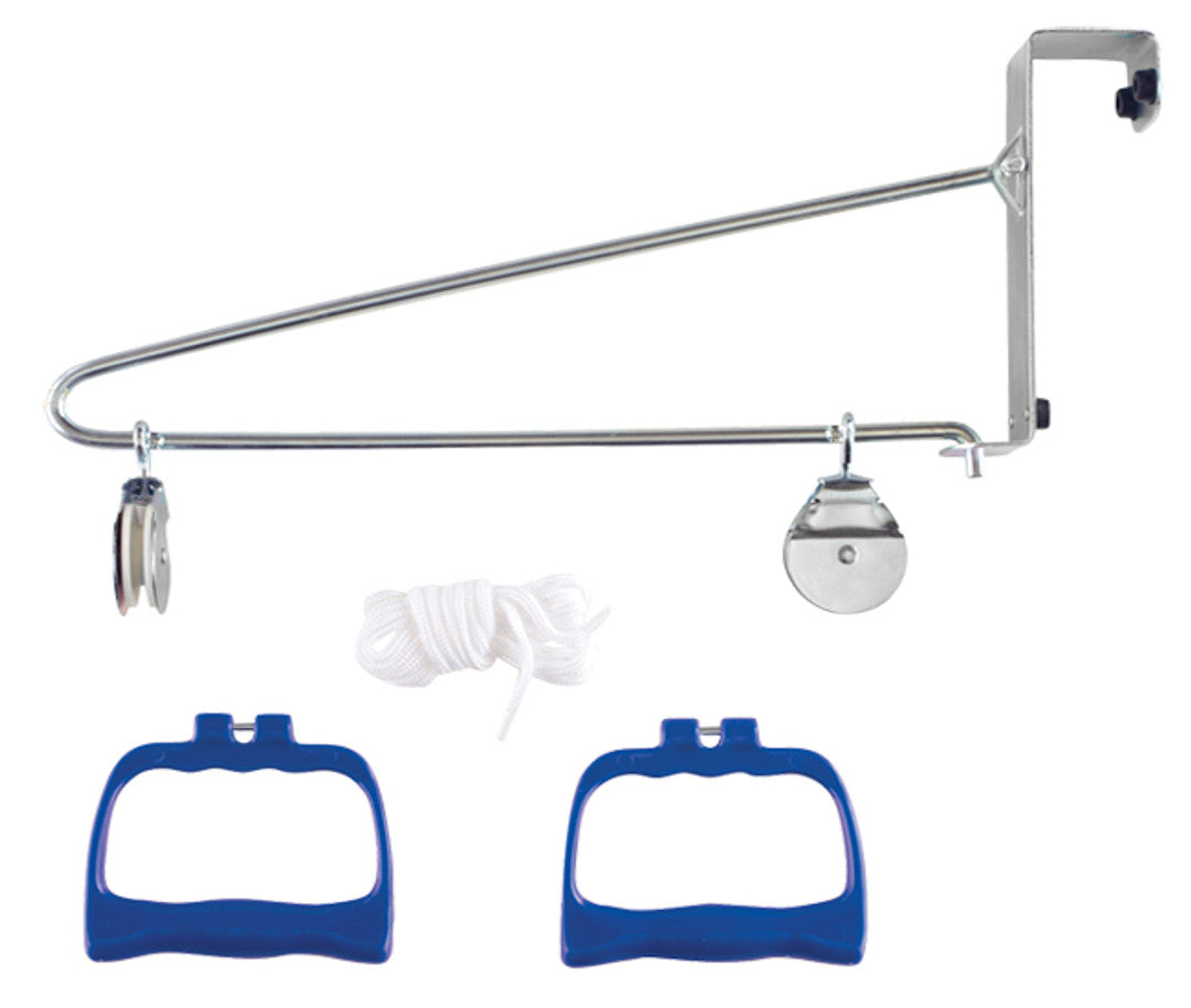 - Easily fits over a standard door, and comes complete with door bracket, pulleys, cords, and handles.