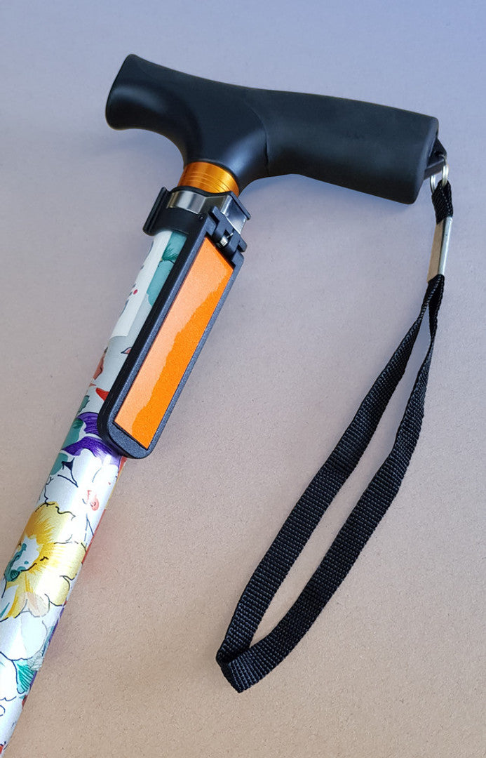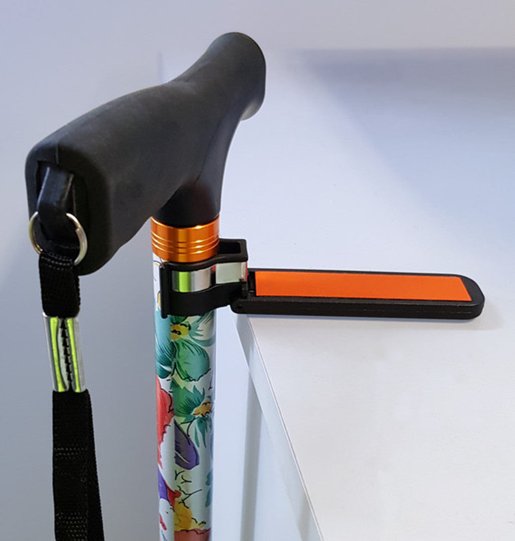 This practical attractive device attaches to a standard cane, allowing it to be suspended from any table, desk or flat surface