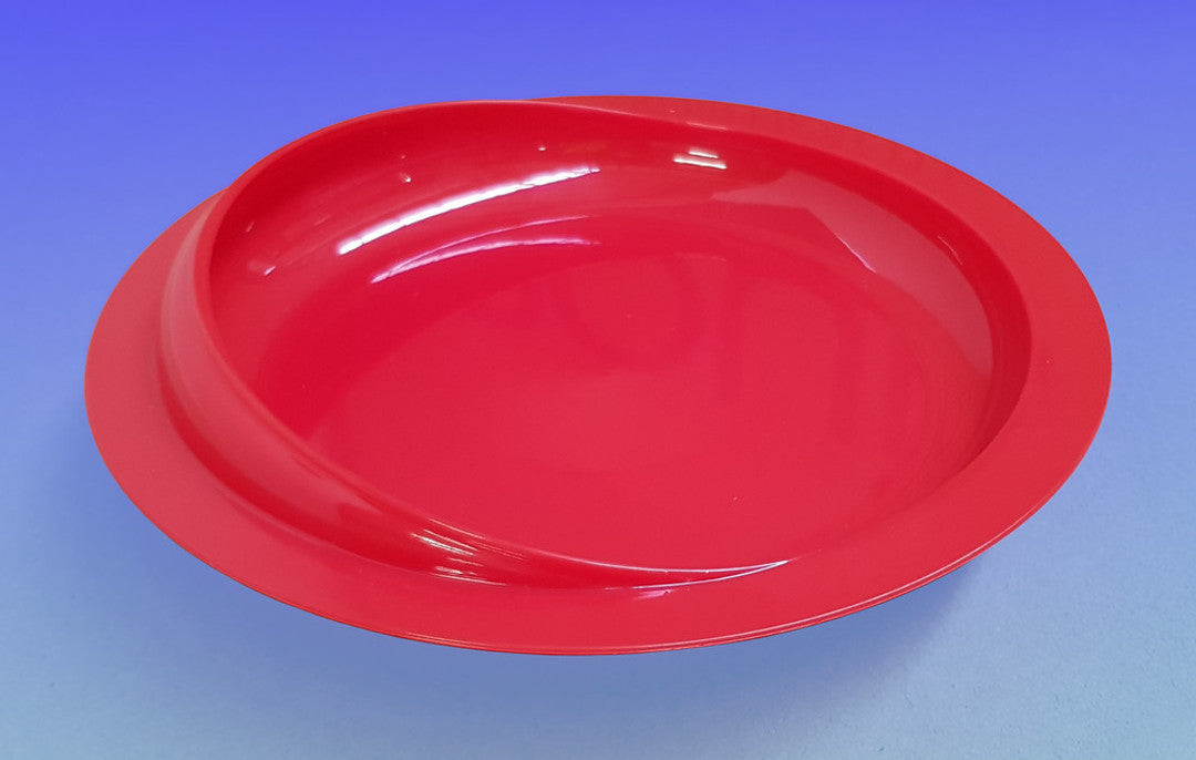 The raised lip on one side of this scoop dish aids in loading food onto a fork or spoon to assist individuals who have difficulty when eating, particularly with one hand