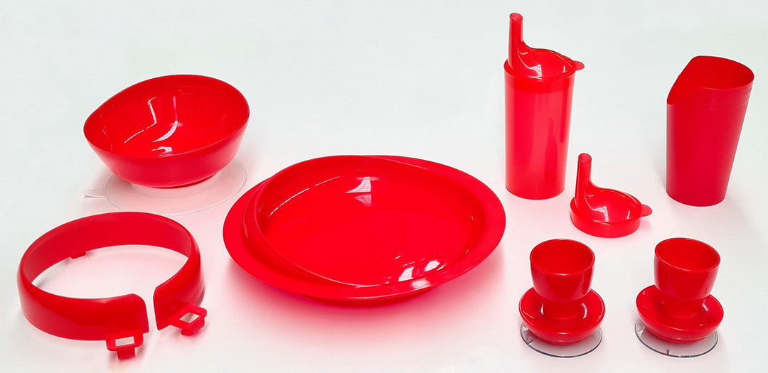 This red coloured dining set can help Alzheimer's sufferers to distinguish the colour of food enabling them to enjoy more and possibly increase their food and liquid intake. The contoured rim design of the bowl and dish allows food to be scooped easily onto utensils making them ideal for use for those who are single handed